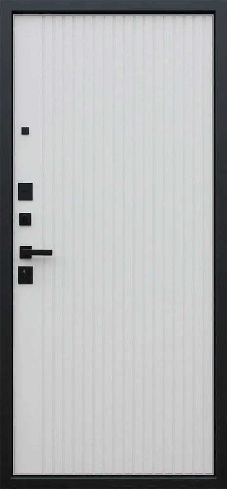 Порошковое покрытие "Муар черный". Экошпонированная дизайнерская панель МДФ 10 мм. Линейная фрезеровка. Цветовая комбинация: "дуб кантри темный", черное патинирование по фрезеровке. Наличник МДФ гладкий 80 мм., цвет "черный кварц".